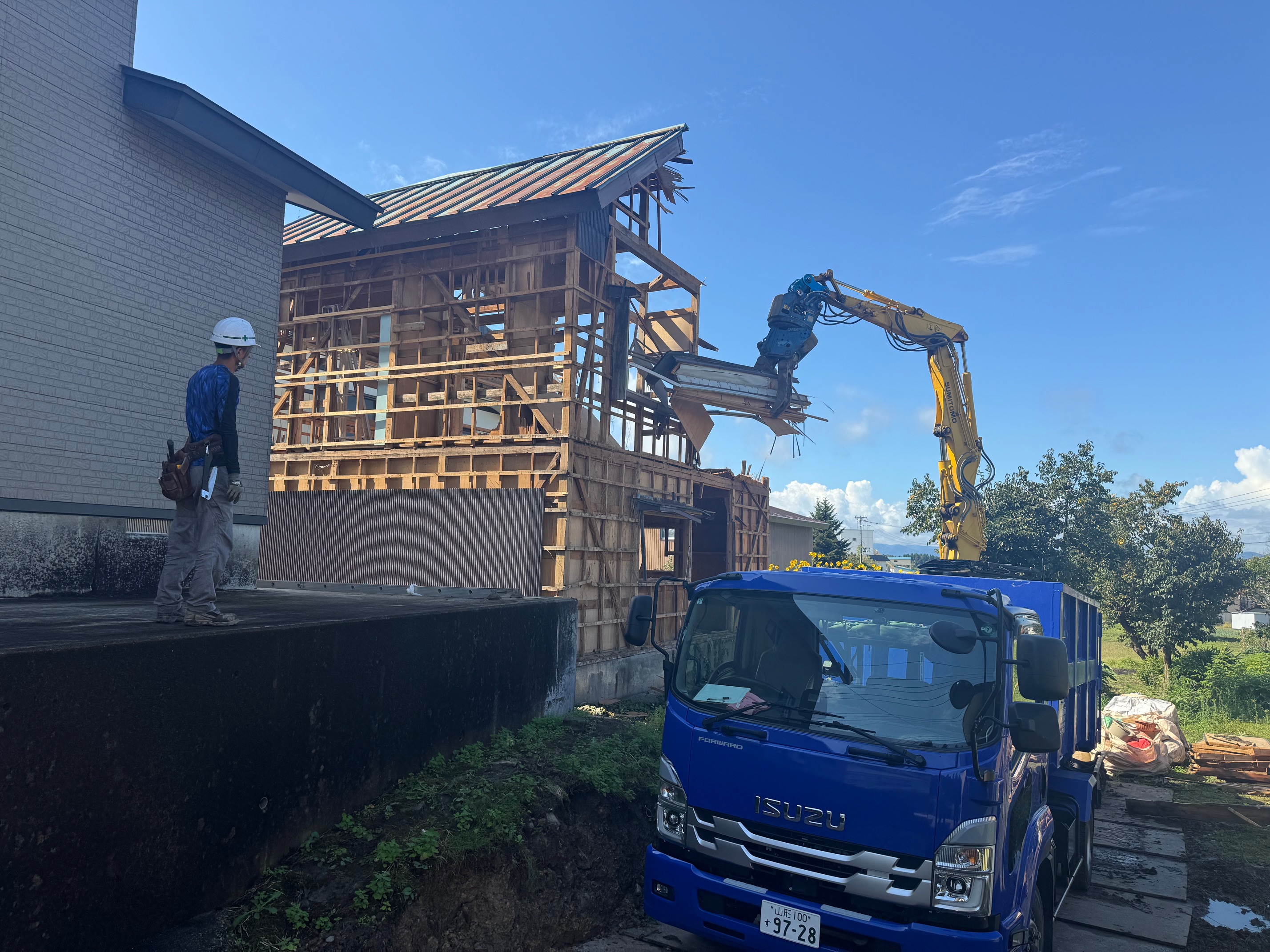 今日は天気よく解体工事も進みます稲刈りが天候不順で進んでない為作業員も最小人数での作業です小さな小屋なのですぐに終わると思いますが安全第一で頑張りましょう